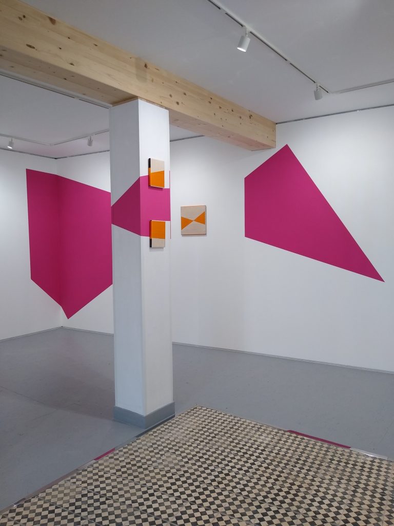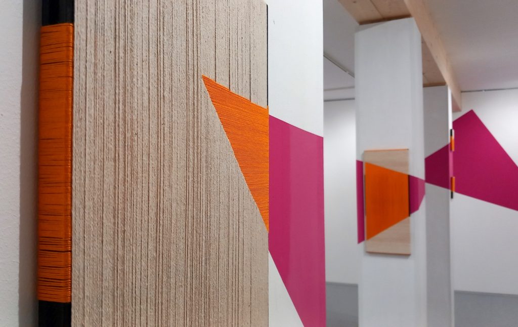 For the in sito work “Braço a Braço”, Jan Bourquin integrates the existing gallery room and deals with the interaction of surface and spatiality. Through the technique of anamorphosis, the reshaping, which can be traced back to the 17th century in art history terms, the visitors themselves become a decisive part of the work. The form can only be perceived in its original shape from a certain angle determined by Bourquin. As soon as the recipients move through the room, there is a shift in perspective that leads to a change in the original form. The audience actively engages in the field of tension between spatiality and surface and shapes the work through self-chosen points of perception. The woven pictures by Sandra Bourquin follow the coloured fields and continue the form. The pieces of the two artists enter into a mutually stimulating connection and unite to create an overall impression. This collaboration, the arm in arm, the encounter of the works, condenses on the wall in the meeting of the colour fields in a tender kiss.